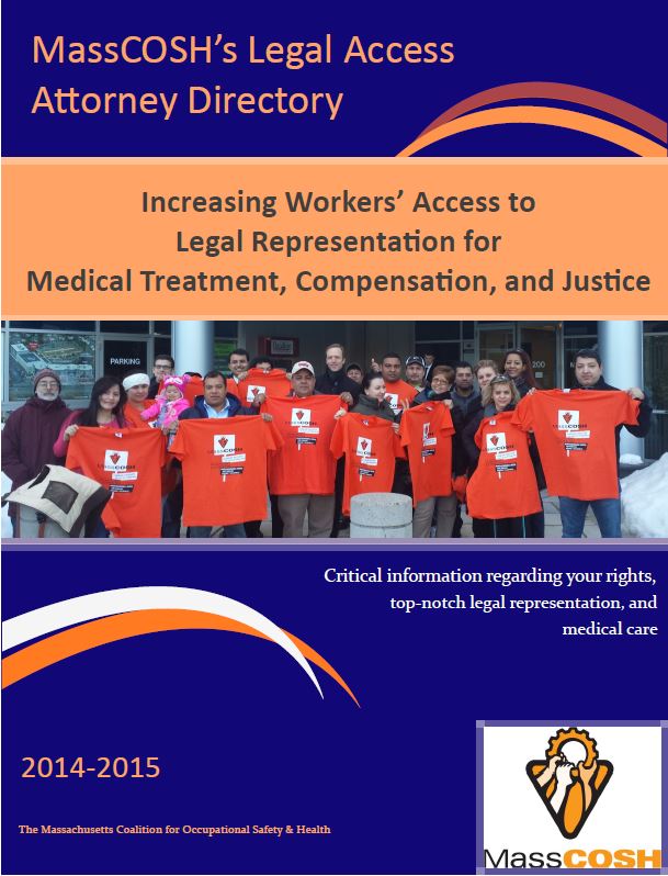 The 2014 MassCOSH Legal Access Attorney Directory is our latest effort to ensure that all workers have the tools and resources to fight against unjust and unsafe working conditions. The critical funds donated by the legal professionals in this document will be used in the coming year to link low-wage workers with essential legal and medical resources and to advocate for strong worker protections.  The work we do would not be possible without the commitment and dedication of these participating attorneys. Also included in our directory is a listing of medical professionals who were recommended by injured workers and attorneys for their expertise in diagnosing and treating injured workers. Each accepts Workers’ Compensation insurance.